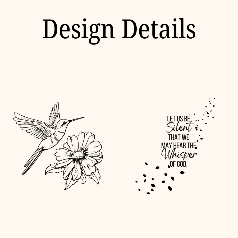 The Whisper of God design has the lovely quote on the front as a daily reminder to be silent and listen to the whisper of God, while the back has a lovely hummingbird and floral.
