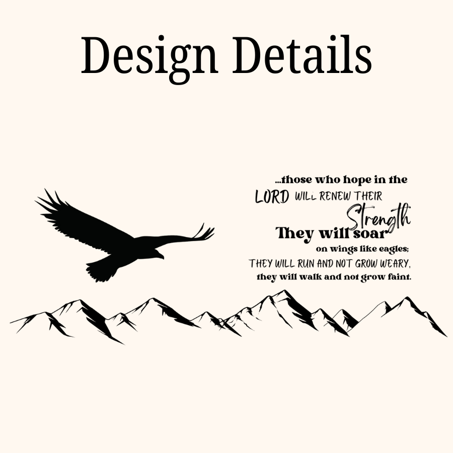 The Soar Like Eagles design has the Bible verse on the front, Those who hope in the Lord, will renew their strength. They will soar on wings like eagles, they will run and not grow weary, they will walk and not grow faint" along with the majestic mountain scenery while on the back of the tumbler we have a gorgeous eagle flying high over the mountains.